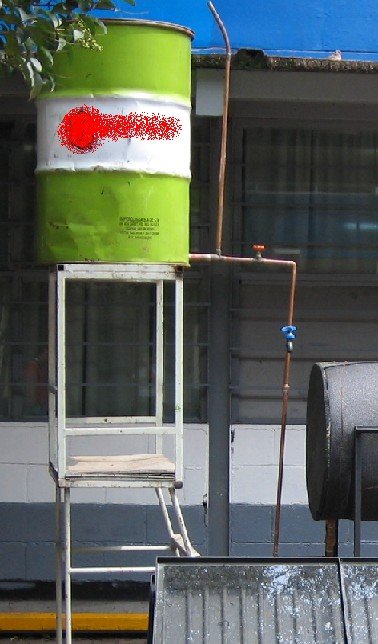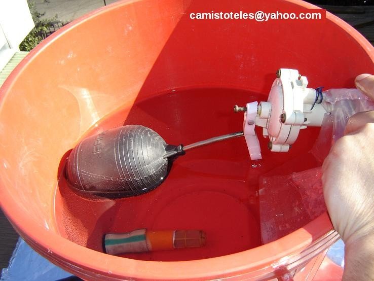 Foto del tanque de alimentación que hizo Camilo Rojas C. con un bote grande de plástico (de los que se utilizan para basura y tienen tapa).