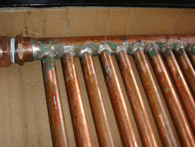 Dado que el calor que genera la autógena puede deformar el tubo de cobre, hay que soldar primero los tubos de los extremos, después el del centro, después los de los cuartos (los que están entre el extremo y el centro), después en 8vos alternando el lado con la finalidad de que el soplete esté el menor tiempo posible en una zona del tubo, y así hasta terminar los tubos.