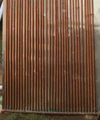 El panel solar, es la tubería que está dentro de la caja que sirve para absorber el calor solar y transferirlo al agua y mientras mejor conductor térmico sea, la eficiencia será mayor, se pueden hacer de otros materiales como cpvc y de diferentes formas como espiral concéntrica o zig-zag . El que propongo es de tipo radiador de tubos de cobre a 1/2″ con 1 pulgada entre centros (puede ser de 1″ = 2.5 cm a 6 cm entre centros) y cabezales de 1″.