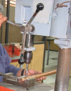 Escantillón: Para fabricar el escantillón hice lo siguiente: Tomé 30 cm. de ángulo de 1 1/2″ x 1 1/2″ coloqué el ángulo y el tubo en la prensa buscando que coincidan ambos extremos, medí 3.5 cm. de la punta y buscamos el punto donde el ángulo es tangencial al tubo, y marqué ese sitio que es donde irá la primera perforación (aún no se perfora). A partir de allí se marcan los centros a cada pulgada por un lado y en forma paralela al ángulo para que todas perforaciones queden en línea recta en la parte superior del tubo. Quitamos el tubo y perforamos con la broca de 3/16″ El escantillón nos servirá como guía en la perforación de los tubos de 1″ de modo que las las perforaciones queden alineadas y en el diámetro de los tubos.Explicación completa de como hacer el escantillón