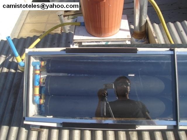 Las conecciones con codos y tuberias plasticas de PVC las hice con manguera de goma resistente a Tº que encontré en un botadero. pero pueden sustituirse por mangueras flexibles de buena calidad. Si te das cuenta de las fotos , todo parece artesanal. Uds podrían hacer algo mejor. El trabajo lo hice entre porotos y zanahorias pues trebajo en la cocina, por eso se ve el piso y las ollas de fondo en las fotos. Mientras mi mami cocinaba las lentejas yo estaba tras de ella cortando y pegando.
