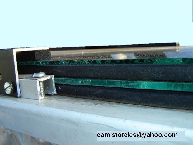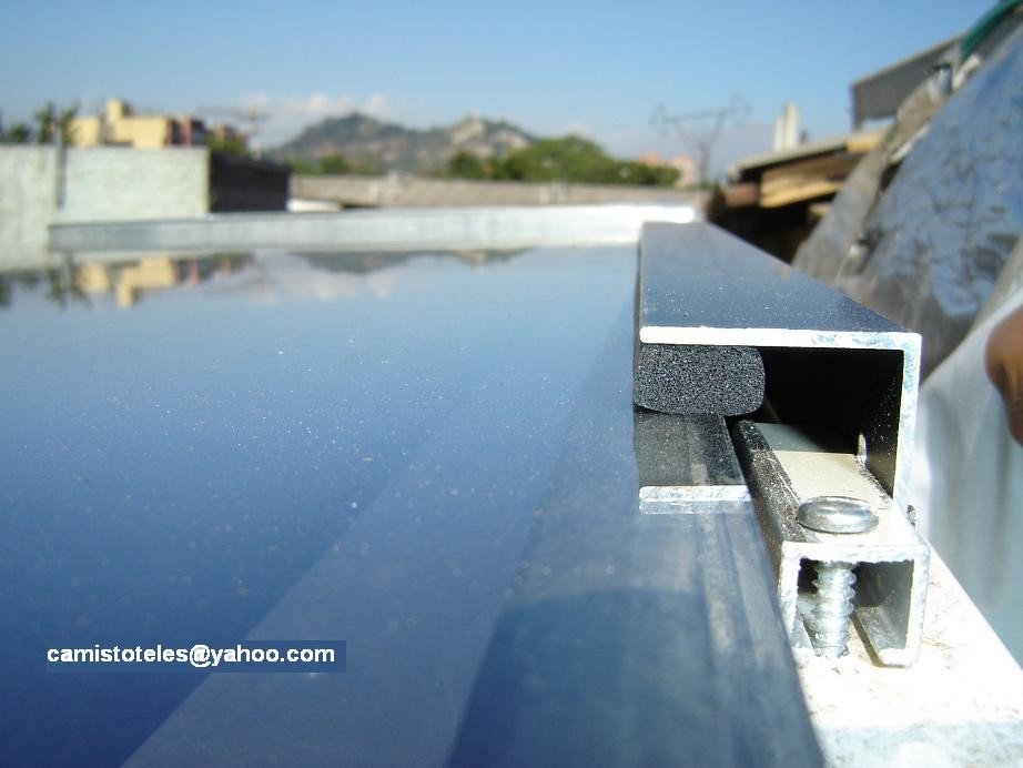 Sobre esa superficie o marco, coloqué una goma o esponja tipo caucho que compre muy barato. Lo encontré ideal para mi propósito. Con el hice un marco pegado sobre la canaleta. Directamente puse el vidrio y luego otra vez una tira de esponja plastica. Es algo elástica y me dió la separacion ideal entre vidrios. Como 7 mm. Luego encontré unos trozos de perfiles de aluminio que botaron en la casa del vecino y los use para presionar todo el “sandwich” de vidrio contra la caja. Con tornillos. (2da foto)