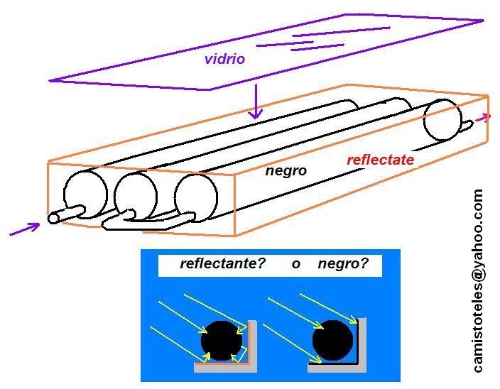 Cuando el fondo es papel aluminio reflectante, la radiación que pasa entre los tubos y que no es captada directamente desde el sol, es reflejada directamente sobre la parte posterior de los tubos negros que la transforman en calor que pasa al agua. Mucha de la energía del sol se pierde pues este sólo incide en la mitad de la superficie del tubo. Con el papel reflectante, aumento este índice al redireccionar los rayos hacia la parte posterior de los tubos.