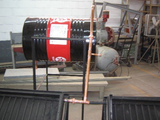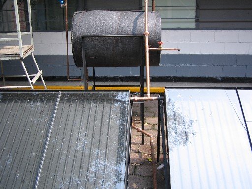 Agradezco al Ing. Juan Miguel Gómez Coyt por compartir su experiencia y fotografías en la fabricación de este calentador que está funcionando en su casa. En la foto se ven los termotanques, el de la izquierda estaba funcionando y el de la derecha estaba por conectarse.