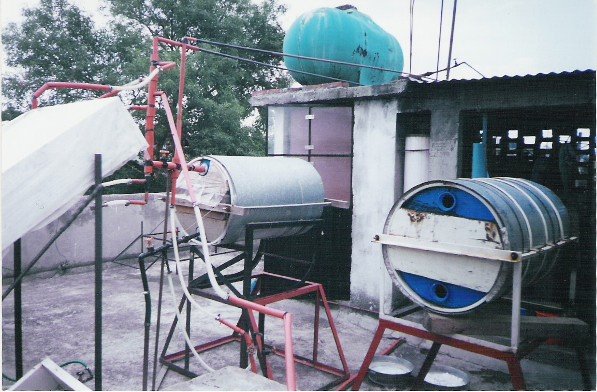 Agradezco al Ing. Juan Miguel Gómez Coyt por compartir su experiencia y fotografías en la fabricación de este calentador que está funcionando en su casa. En la foto se ven los termotanques, el de la izquierda estaba funcionando y el de la derecha estaba por conectarse.